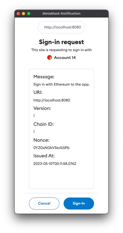 localhost:8080 wants you to sign in with your Ethereum account: